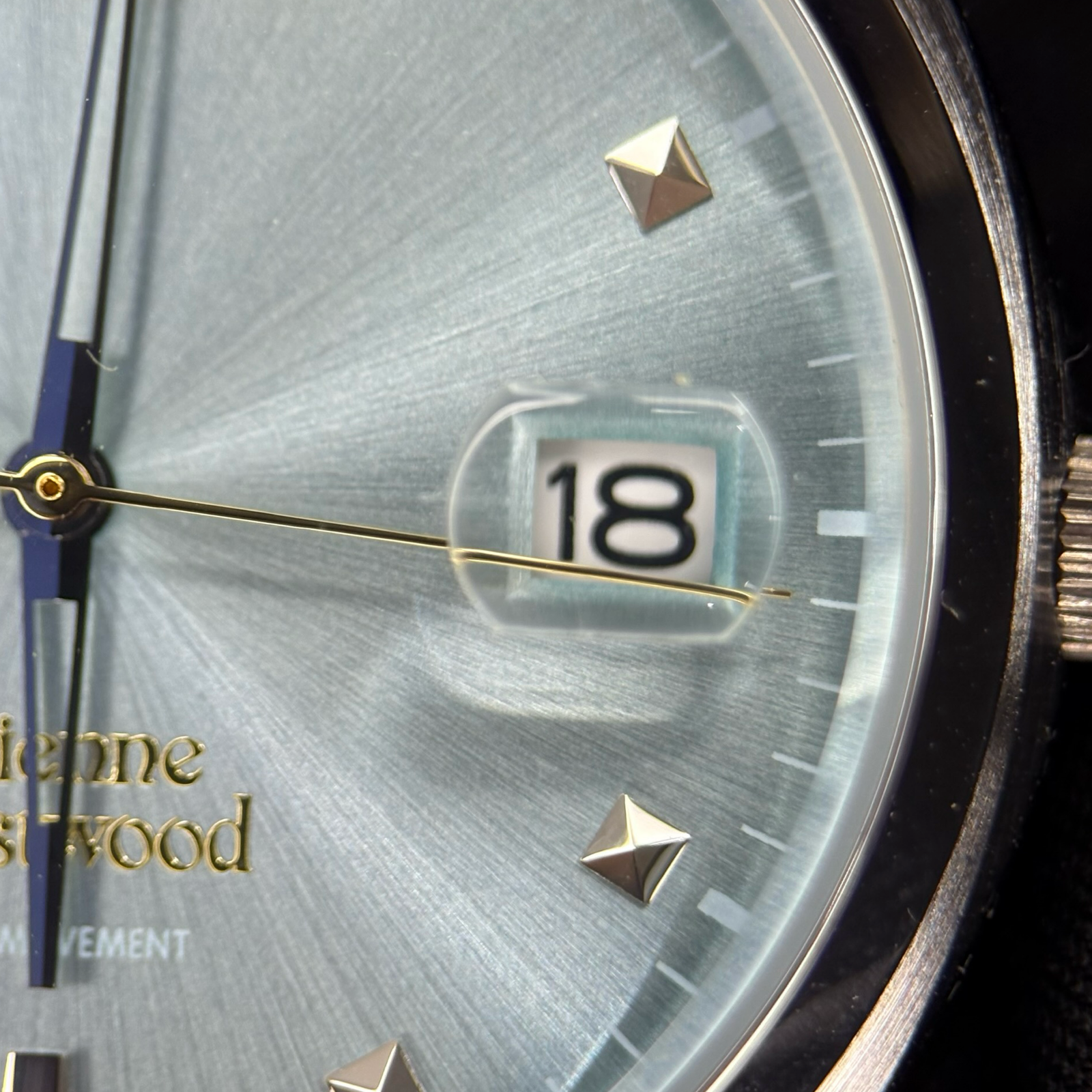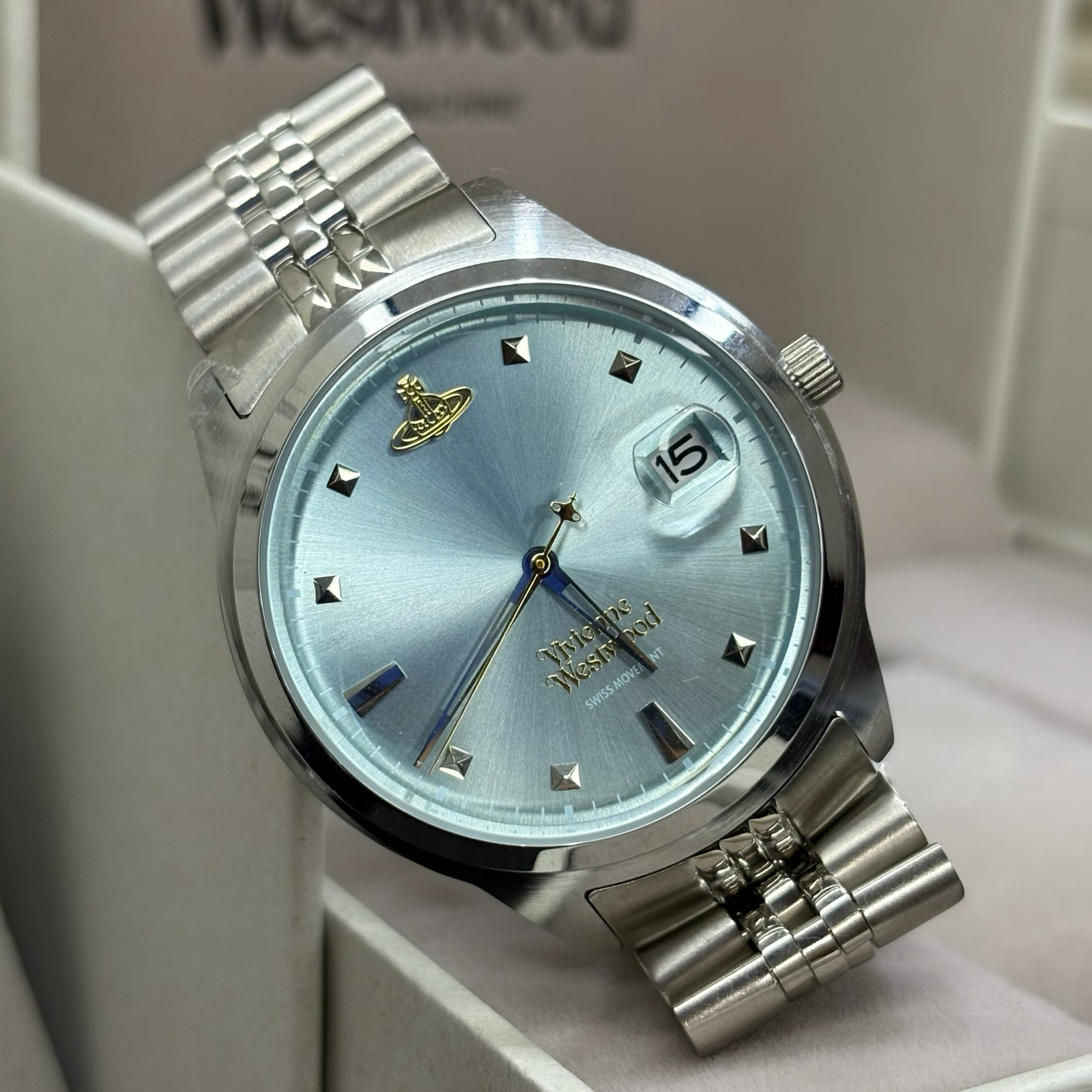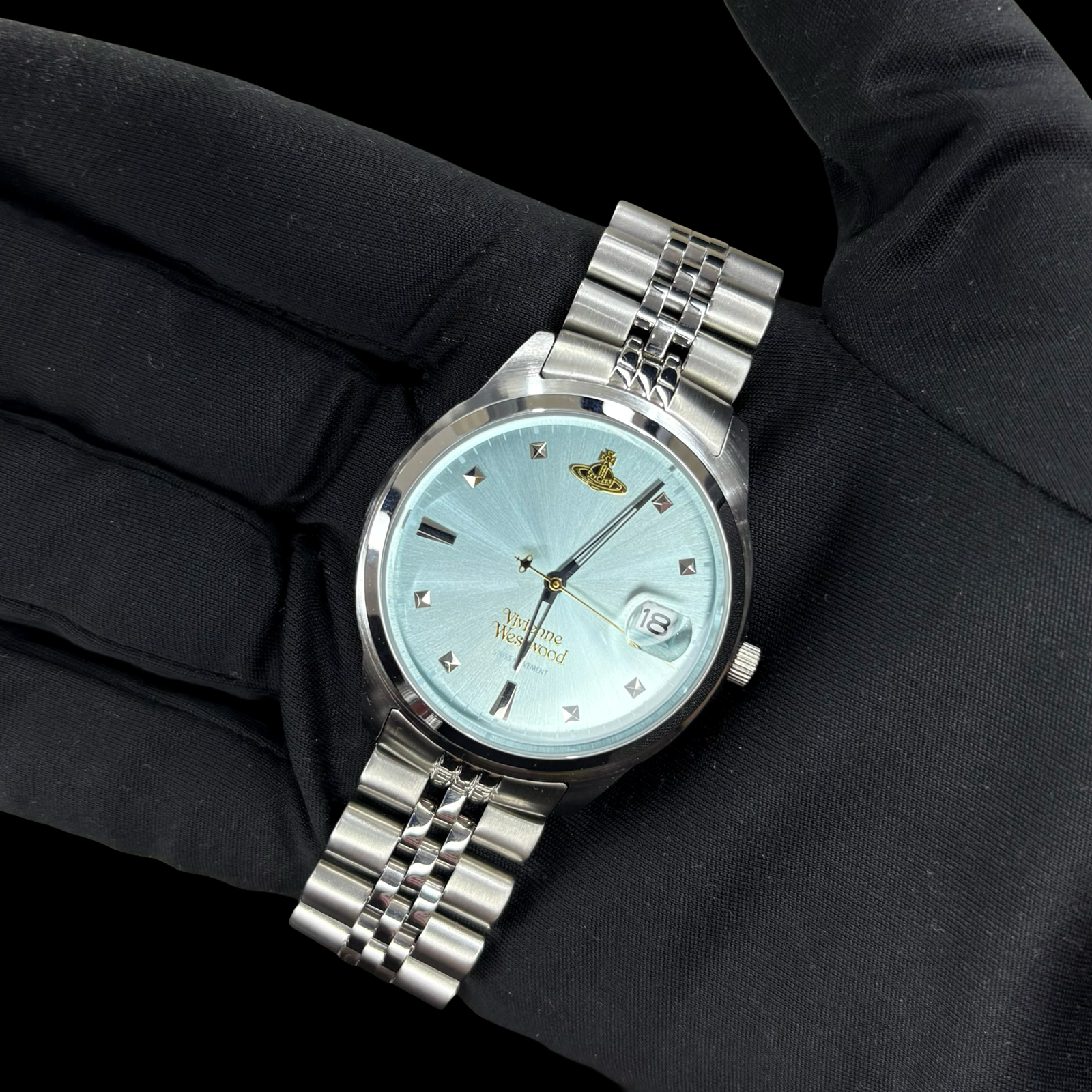 A bold dupe inspired by the iconic Camberwell-style aesthetic crafted for those who love statement watches with a luxury feel. This silver timepiece features a striking ice-blue sunray dial with pyramid-style index markers and a magnified date window that adds instant depth and dimension. The golden emblem-style detailing on the dial brings a refined contrast, making the watch look premium from every angle.