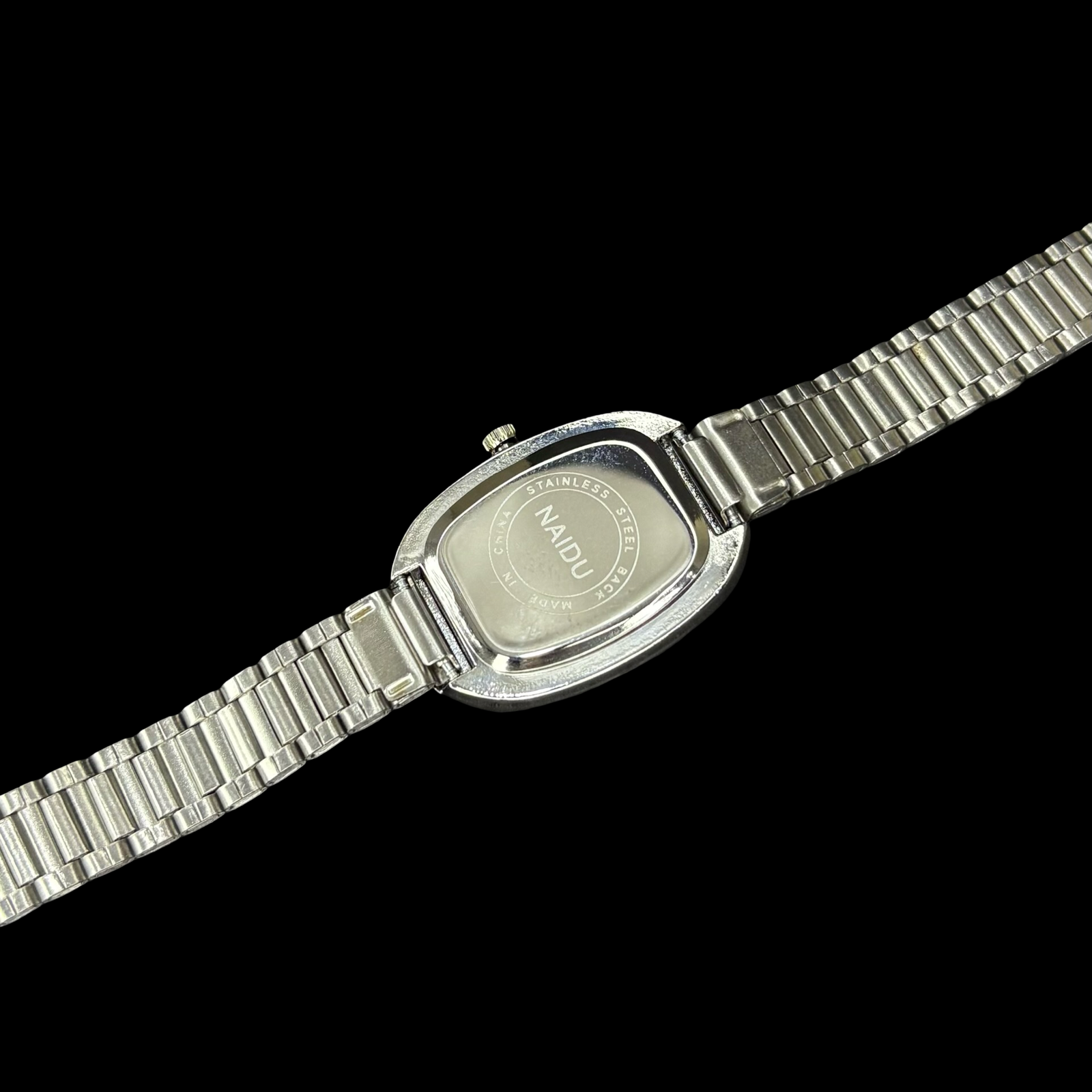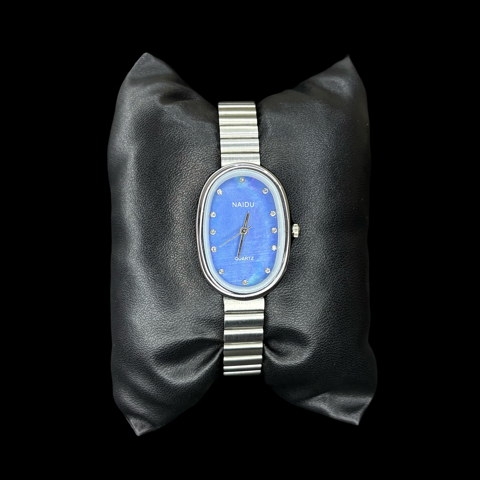 A sleek and timeless silver bracelet watch designed with a clean oval blue dial and minimal crystal-style markers. Crafted for a modern yet vintage-inspired look, this piece combines simplicity, elegance, and everyday versatility. With a 20 cm full length and a 3×2 cm dial, it sits comfortably on the wrist while maintaining a refined, unisex appeal.