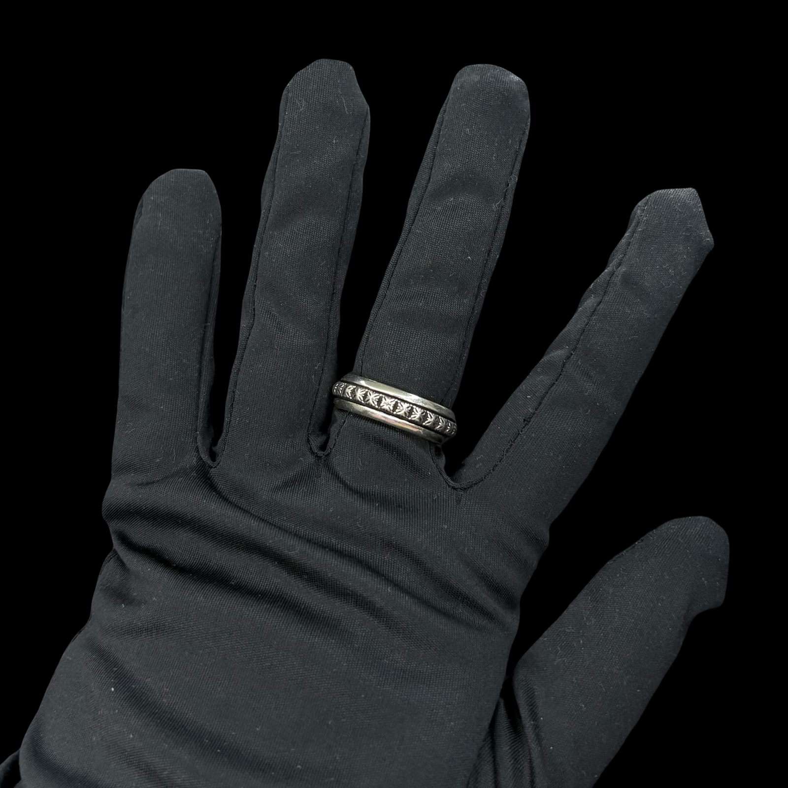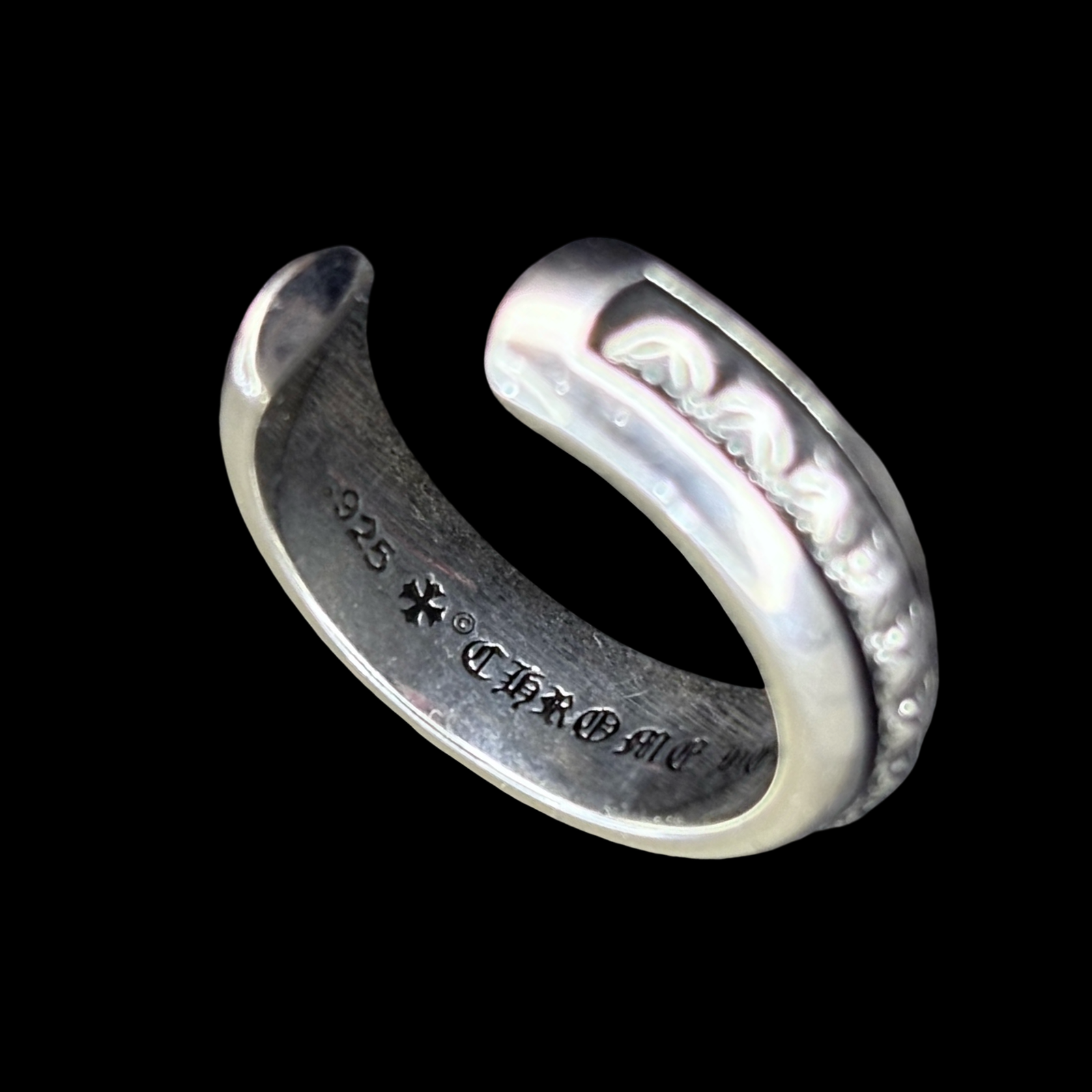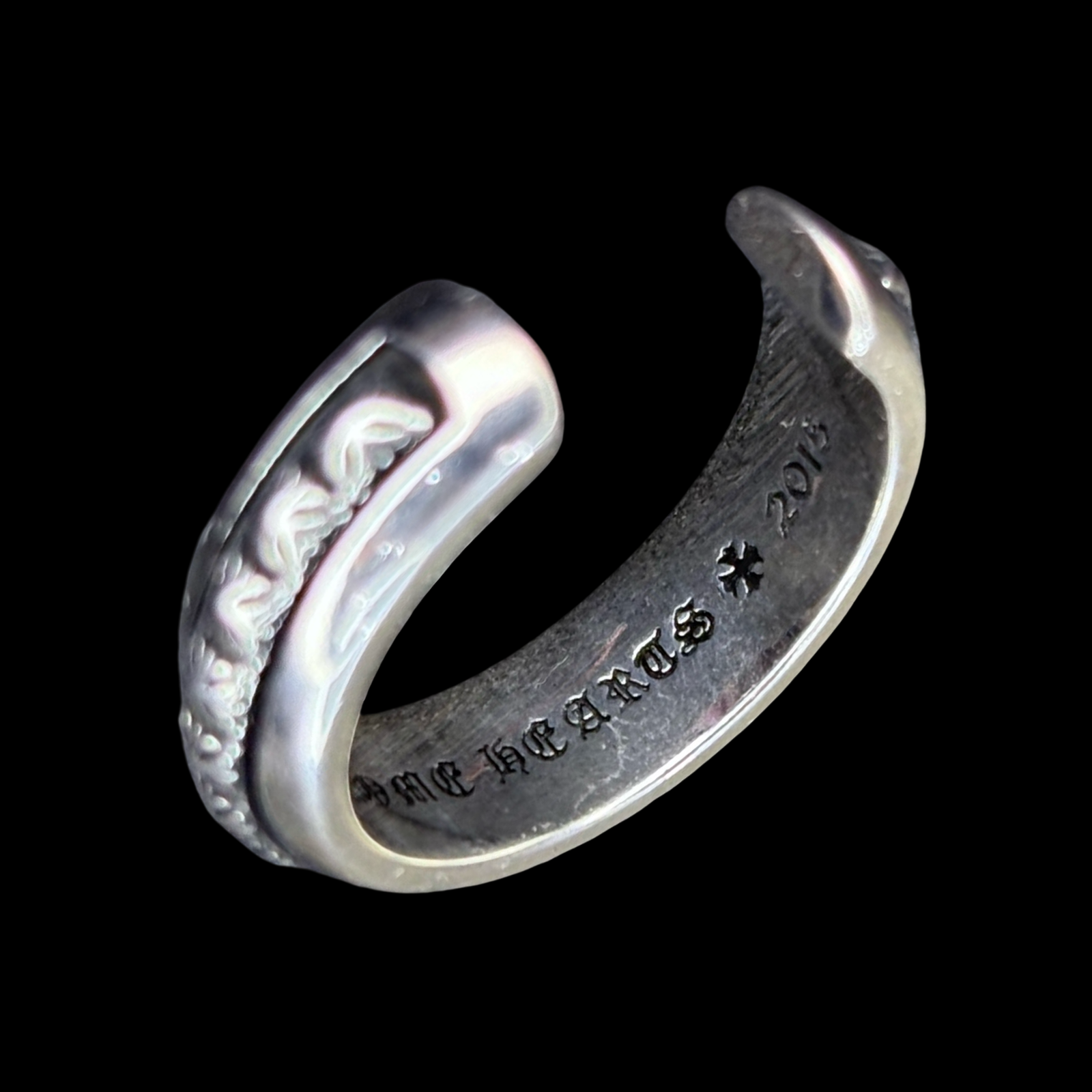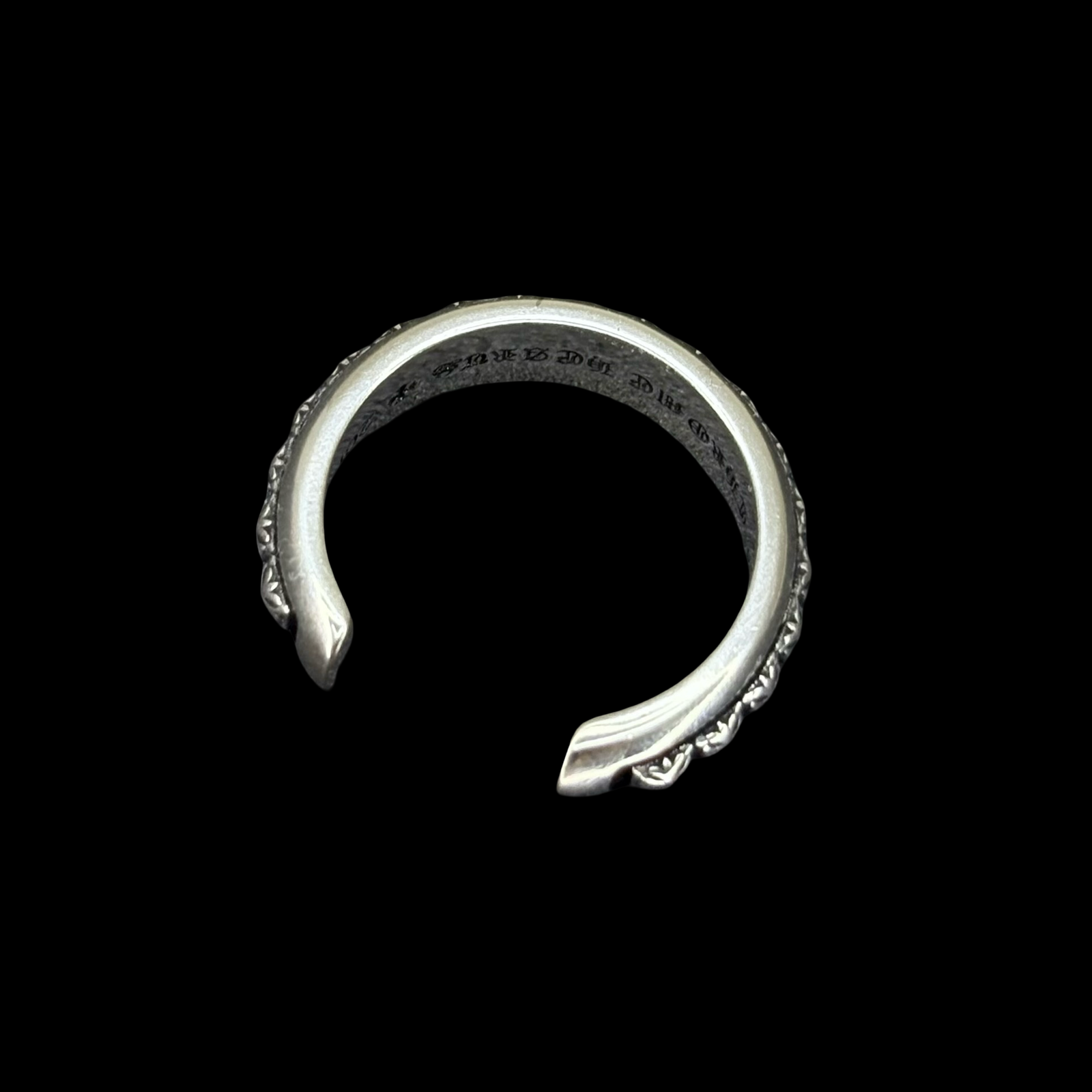 Inspired by the original Chrome Hearts ring, this piece is crafted from stainless steel and comes in a US size 10 as per chart 20. It features a blurry engraving of “Chrome Hearts” inside the band and is non-adjustable, offering a stylish and durable option for everyday wear.