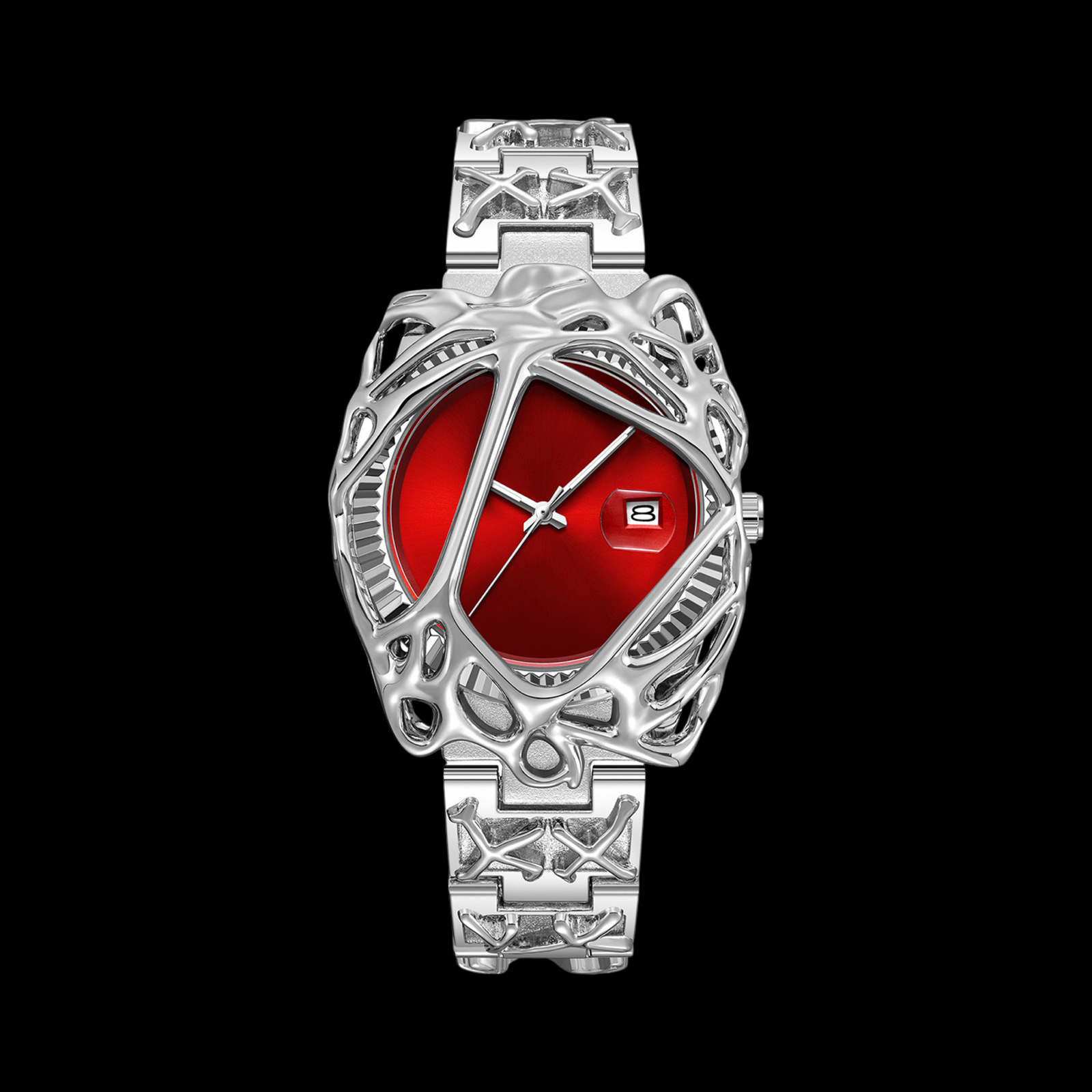 A striking, futuristic statement watch designed for those who love bold accessories with an artistic edge. This piece features a deep red dial encased in an intricate sculpted silver frame, giving it a dimensional, almost armor-like aesthetic. The unique lattice-style bezel wraps around the circular dial, making it look like wearable art rather than a conventional timepiece.