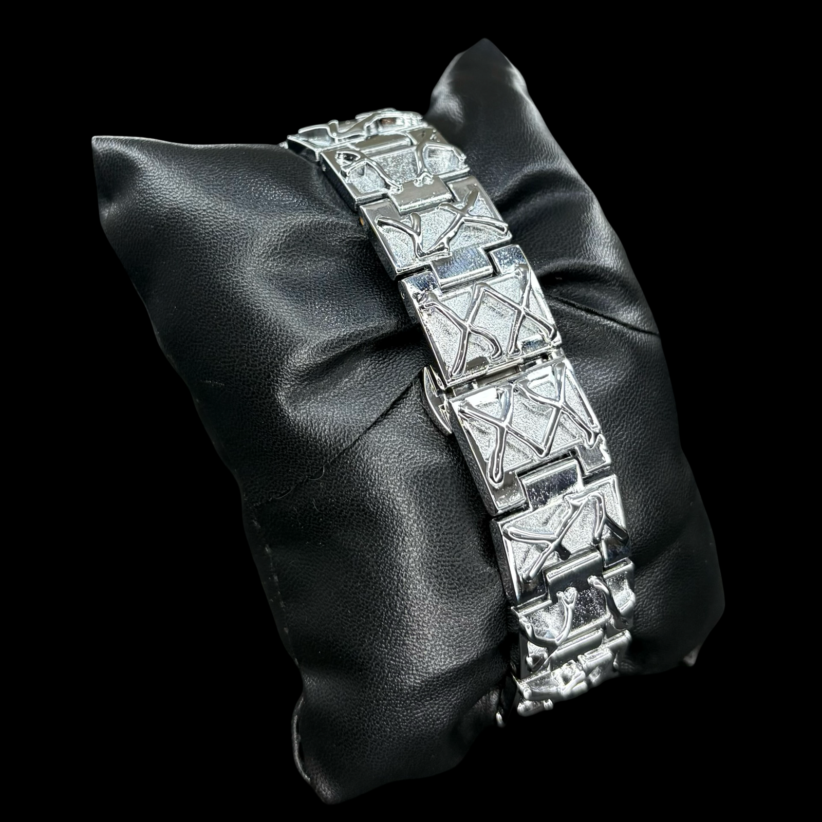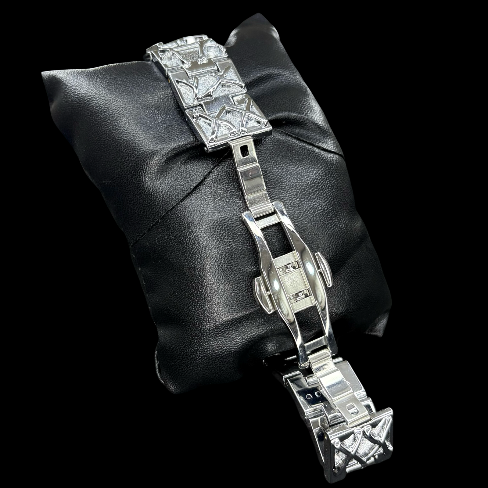 The watch includes a date display on the right side and is paired with a matching silver link bracelet featuring sculpted motifs that tie into the overall design. Lightweight yet impactful, this watch is perfect for elevating both casual and dressed-up looks.