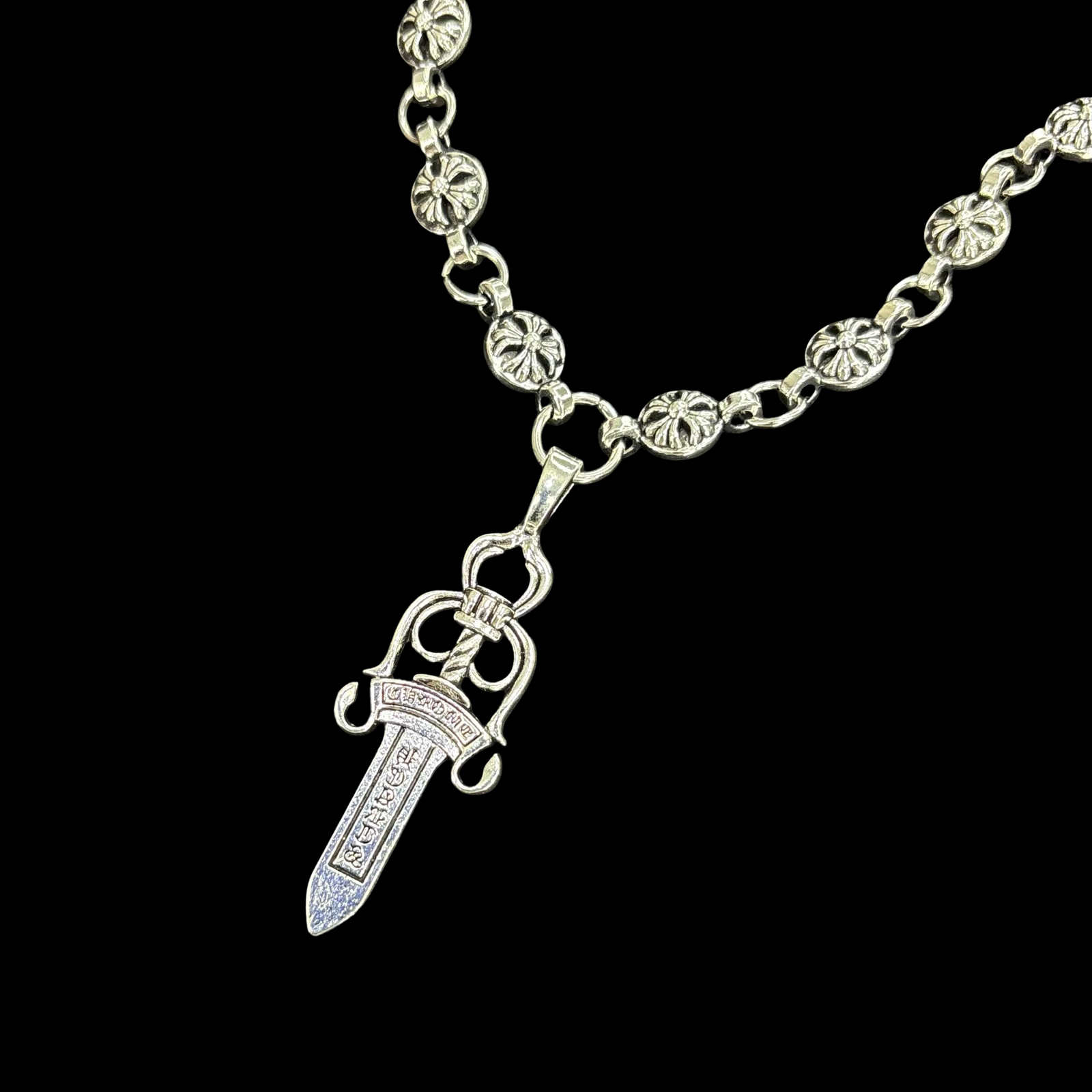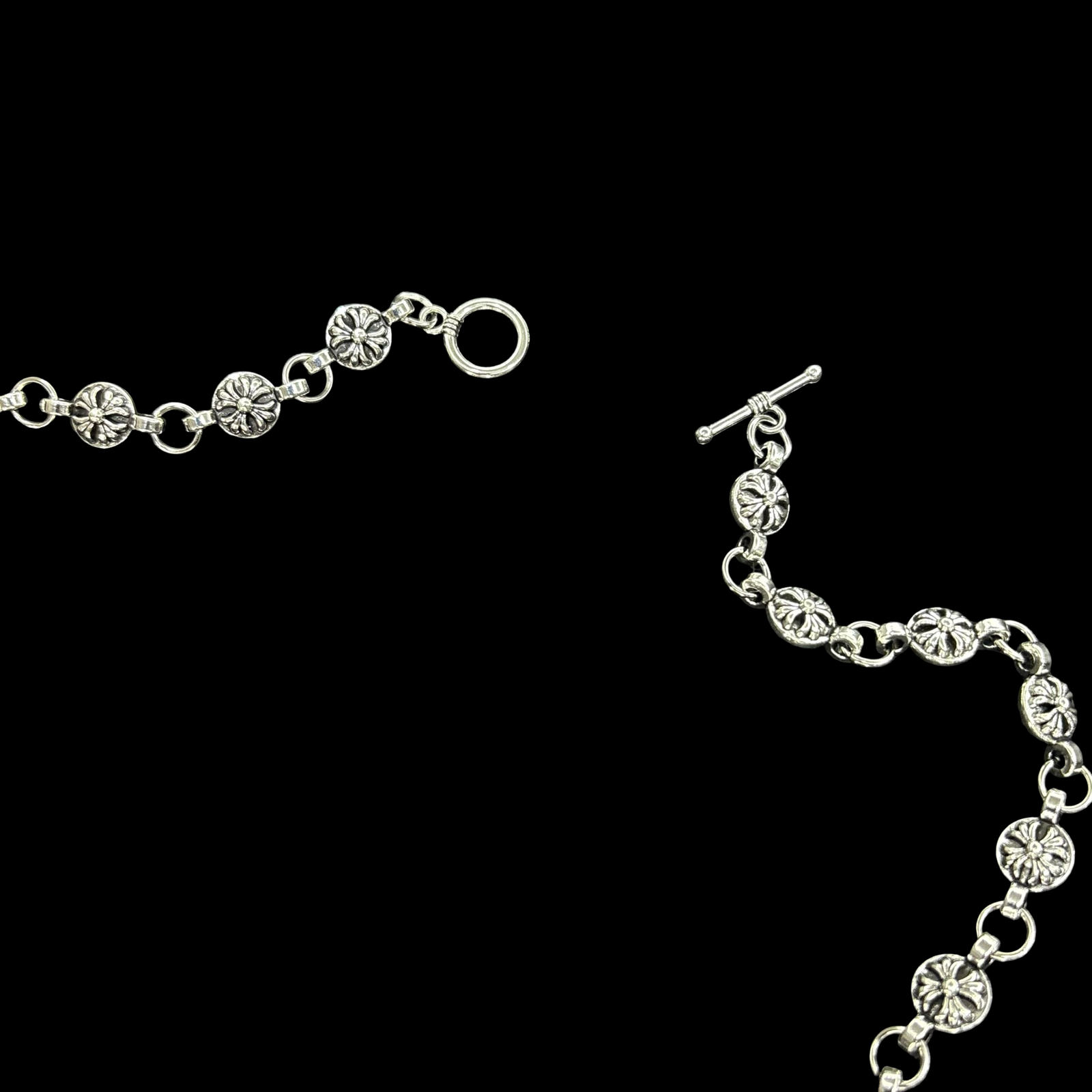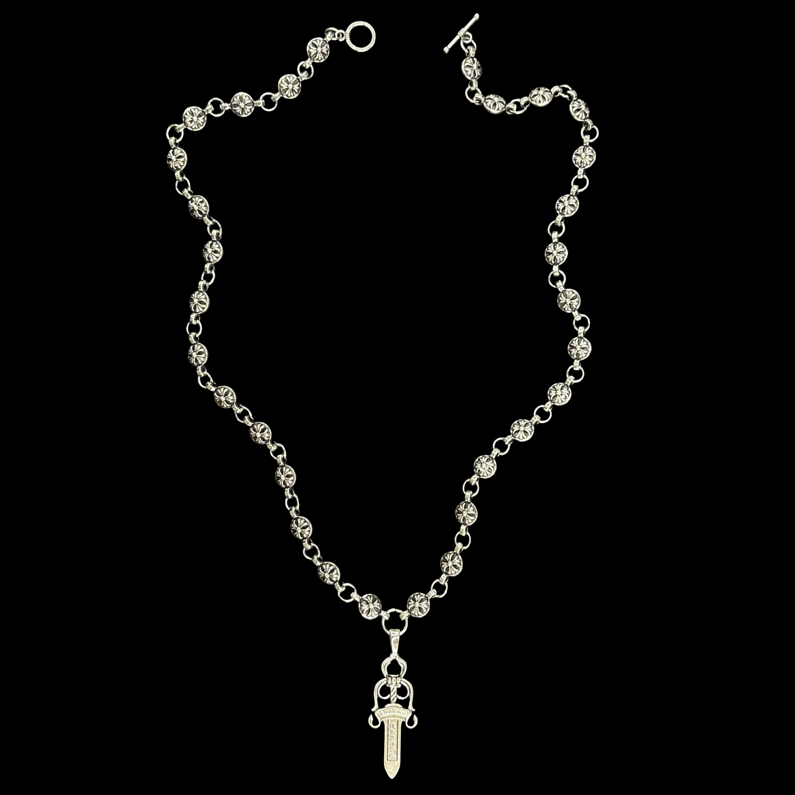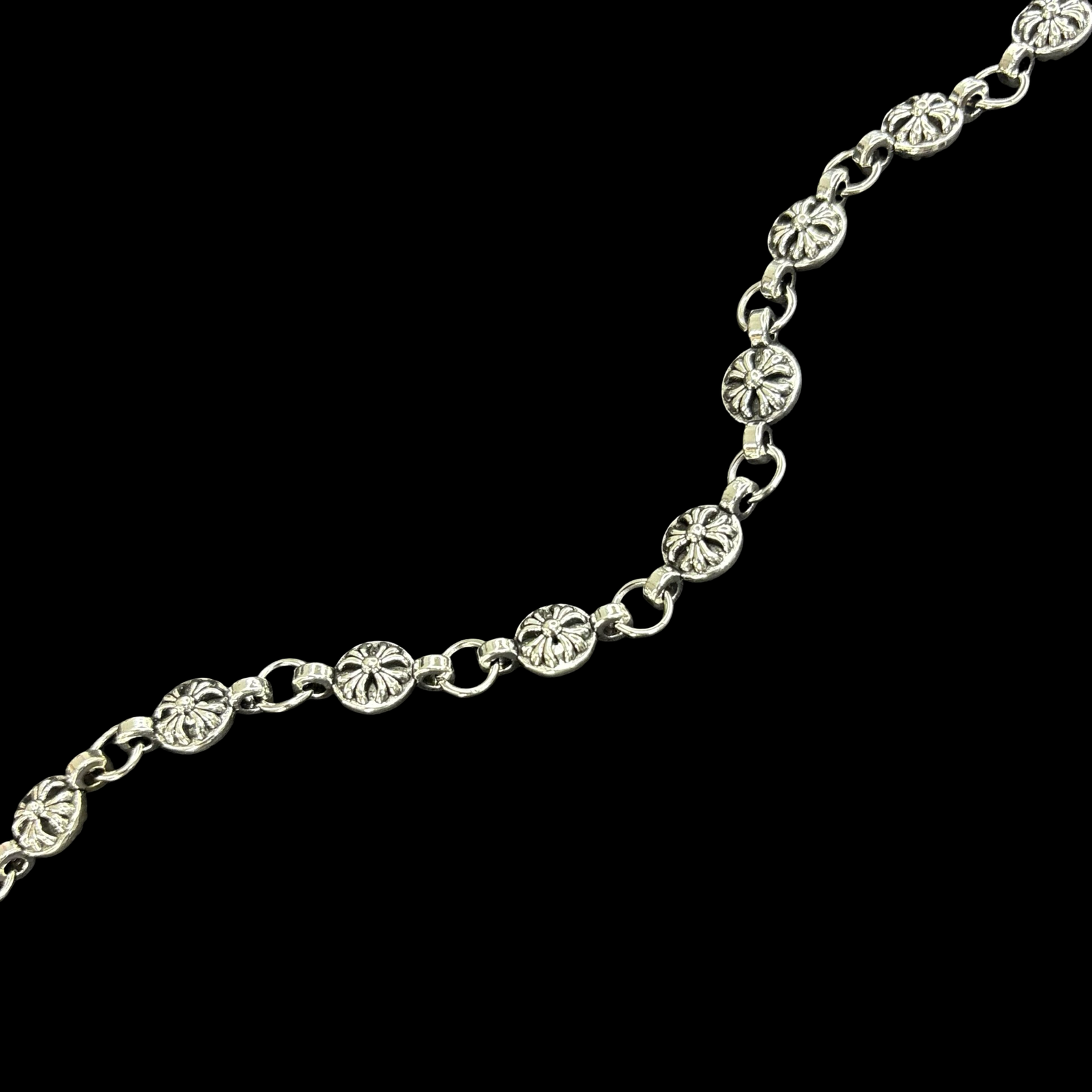This durable 60cm necklace is crafted from stainless steel and features a Chrome Hearts engraving. Both waterproof and tarnish-proof, it offers long-lasting wear. Inspired by the original Chrome Hearts design, it is a high-quality dupe that combines style and durability.