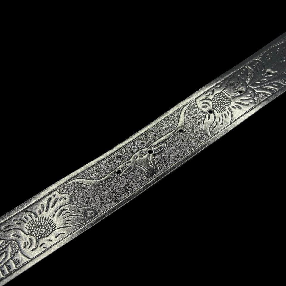 This faux leather belt has a full length of 1.15 meters (approx. 45 inches), with holes positioned to fit waist sizes from 35 to 40 inches. The stainless steel buckle measures 5 cm by 12 cm (approx. 2 x 4.7 inches), and the belt strap is 4 cm (about 1.6 inches) wide. The sleek black faux leather features a detailed bull & vine pattern.