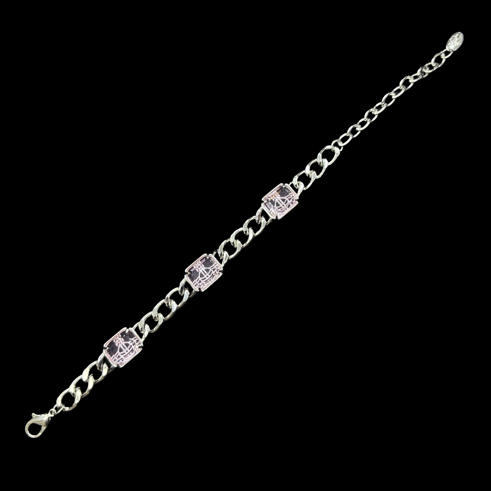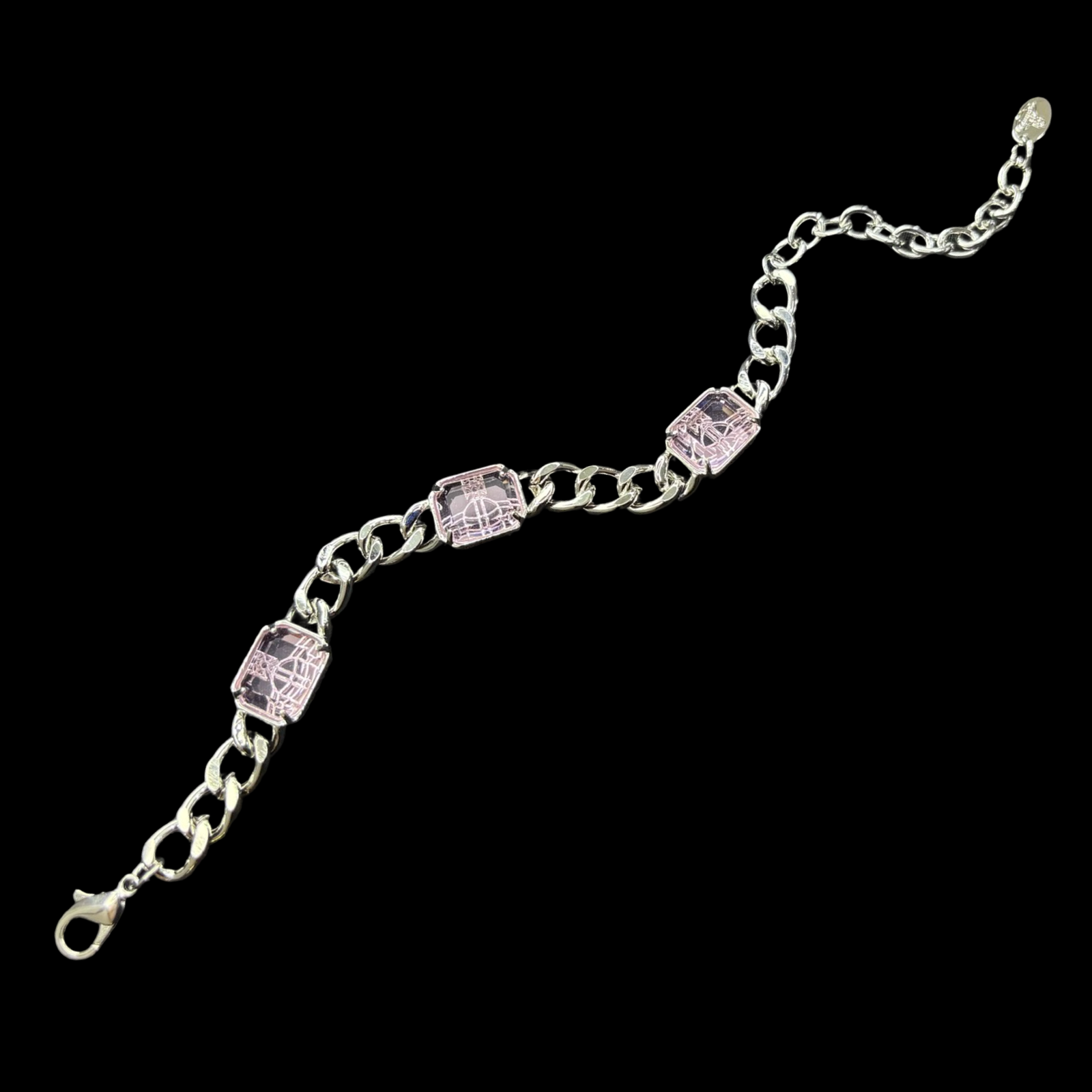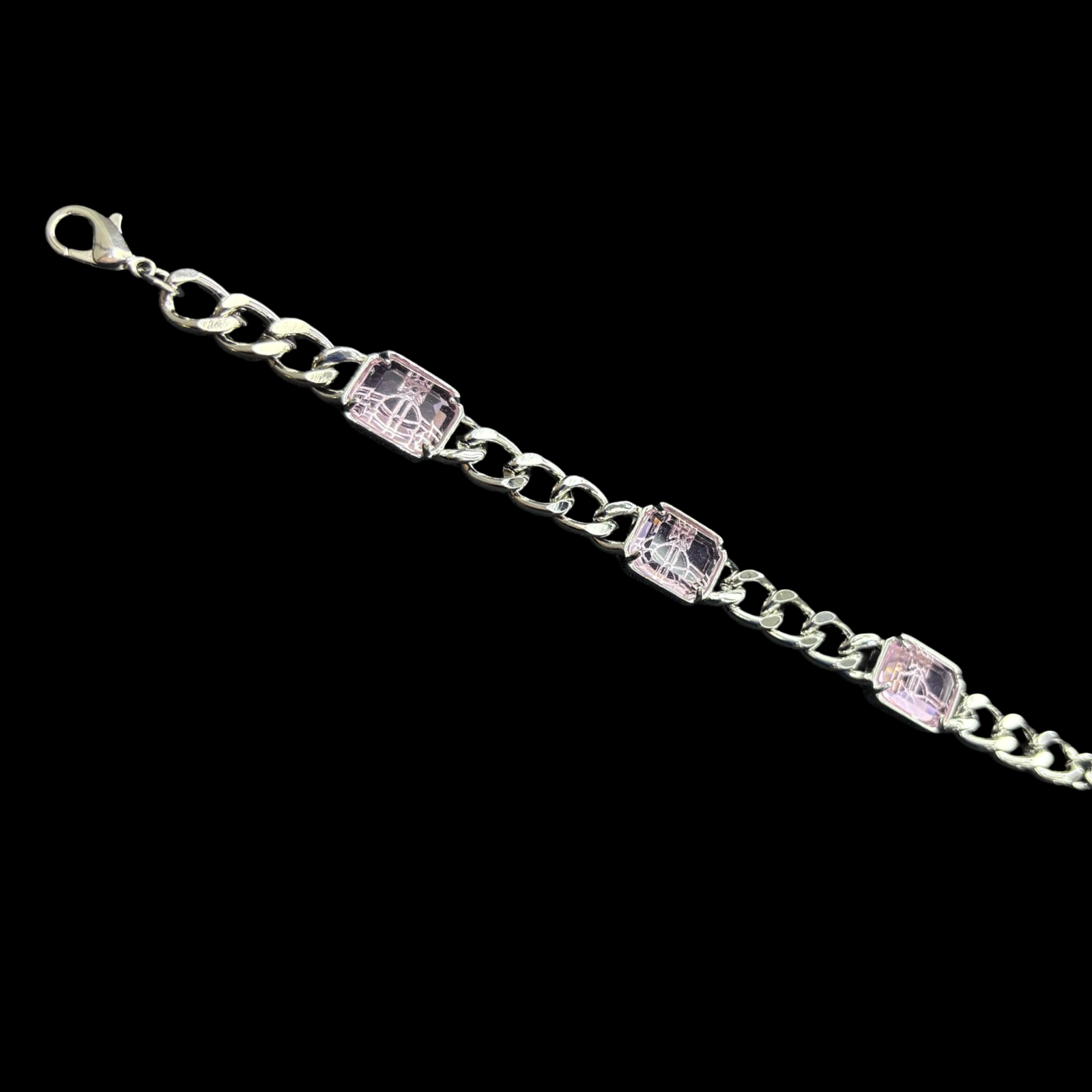 This elegant bracelet features a soft pink stone charm accented with intricate orb detailing engraved through the stone, adding a bold yet refined touch. Crafted in durable stainless steel, it’s designed for long-lasting shine and everyday wear.
